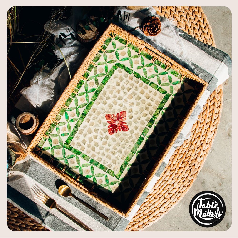 Discover the epitome of elegance intertwined with a conscience for sustainability with Table Matters’ ORNATE Midnight Guppy Rattan Serving Tray (Large). It is a piece that doesn’t just sit on your table but enchants your evenings. turning ordinary nights into a tapestry of memorable moments. Meticulously crafted from the sustainable embrace of Rattan and Shell. this serving tray is not just an object but a commitment to our planet. Its generous dimensions. 36cm by 26cm. are perfectly poised to host a delightful array of beverages and snacks. ensuring you are always in good company.